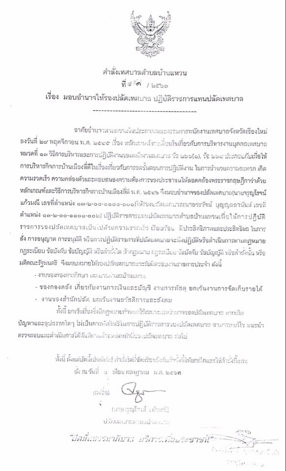อาศัยอำนาจตามความในประกาศคณะกรรมการพนักงานเทศบาลจังหวัดเชียงใหม่ ลงวันที่ 29 พฤศจิกายน 2545 เรื่อง หลักเกณฑ์และเงื่อนไขเกี่ยวกับการบริหารงานบุคคลเทศบาล หมวดที่ 13 วิธีการบริหารและการปฏิบัติงานของพนักงานเทศบาล ข้อ 266(1) ข้อ 268 ประกอบกับเพื่อให้การบริหารกิจการบ้านเมืองที่ดีในเรื่องเกี่ยวกับการลดขั้นตอนการปฏิบัติงาน ในการอำนวยความสะดวก เกิดความรวดเร็ว ความคล่องตัว และตอบสนองความต้องการของประชาชน จึงมอบอำนาจของปลัดเทศบาล ให้รองปลัดเทศบาล ปฏิบัติราชการแทนปลัดเทศบาล เป็นไปด้วยความรวดเร็ว เรียบร้อย มีประสิทธิภาพและประสิทธิผล ในการสั่ง การอนุญาต การอนุมัติ หรือการปฏิบัติราชการที่ปลัดเทศบาลจะพึงปฏิบัติฯ