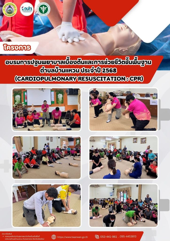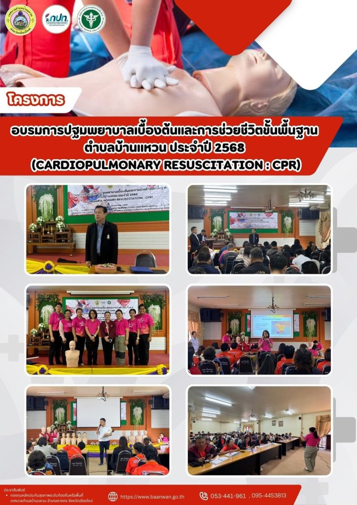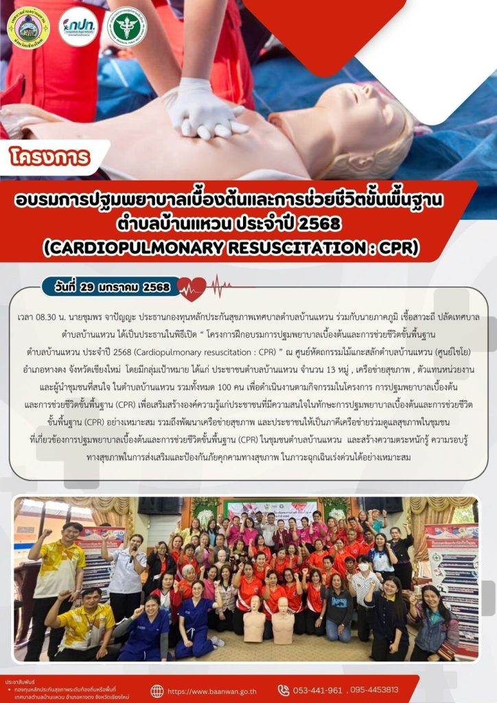 นายชุมพร จาปัญญะ ประธานกองทุนหลักประกันสุขภาพเทศบาลตำบลบ้านแหวน ร่วมกับนายภาคภูมิ เชื้อสาวะถี ปลัดเทศบาลตำบลบ้านแหวน ได้เป็นประธานในพิธีเปิด “ โครงการฝึกอบรมการปฐมพยาบาลเบื้องต้นและการช่วยชีวิตขั้นพื้นฐาน ตำบลบ้านแหวน ประจำปี 2568 (Cardiopulmonary resuscitation : CPR) ” ณ ศูนย์หัตถกรรมไม้แกะสลักตำบลบ้านแหวน (ศูนย์ไชโย) อำเภอหางดง จังหวัดเชียงใหม่ โดยมีกลุ่มเป้าหมาย ได้แก่ ประชาชนตำบลบ้านแหวน จำนวน 13 หมู่ , เครือข่ายสุขภาพ , ตัวแทนหน่วยงาน และผู้นำชุมชนที่สนใจ ในตำบลบ้านแหวน รวมทั้งหมด 100 คน เพื่อดำเนินงานตามกิจกรรมในโครงการ การปฐมพยาบาลเบื้องต้น